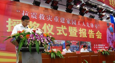 9月5日下午,省教育工会主办的“抗震救灾重建家园工人先锋号”授奖仪式暨报告会在合肥隆重举行,我校弋矶山医院赴川抗震救灾医疗队同时被中华全国总工会和中国科教文卫体工会授予“抗震救灾重建家园工人先锋号”称号。省教育工会和省教育厅领导宣布表彰决定,并代中华全国总工会和中国科教文卫体工会授“抗震救灾重建家园工人先锋号”旗。弋矶山医院院长、抗震救灾医疗队队长芮景同志作为受表彰集体代表作抗震救灾先进事迹报告。来自医疗卫生和教育战线的650余名代表参加了大会。