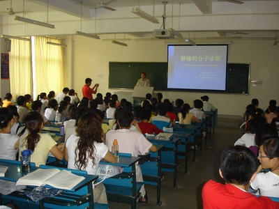 由科研处董群处长主持,张胜乐博士在东103教室,给同学们作了题为“肿瘤的分子诊断”的学术报告,介绍了利用不同的PCR方法及FISH(免疫荧光标记原位杂交法)、CISH(显色原位杂交法)等分子生物学技术对肿瘤进行诊断与指导临床用药,拓宽了在座同学与老师们的视野,在讲座的互动阶段,针对同学们的踊跃提问,张胜乐博士给予了耐心、细致的解答。