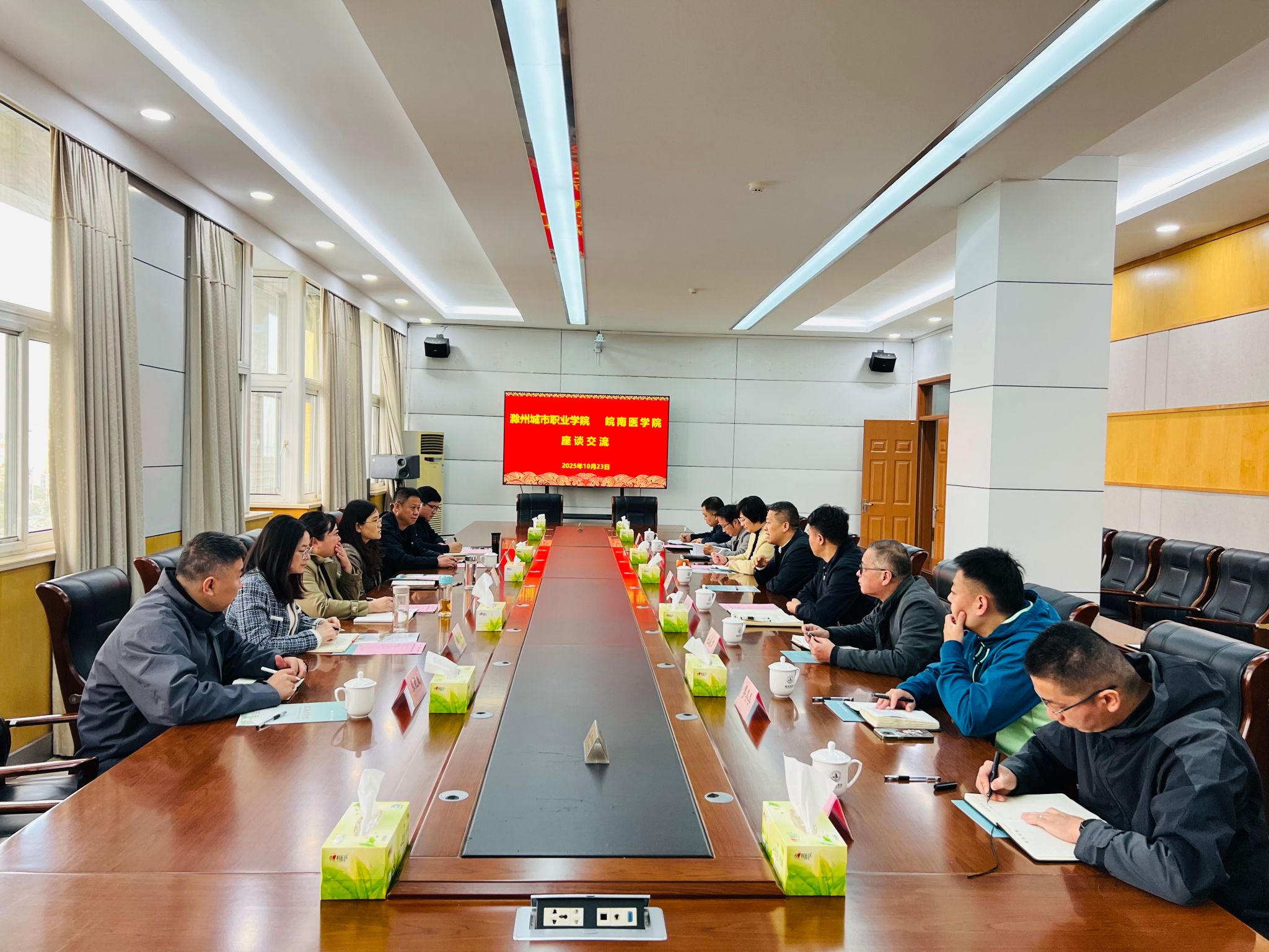 10月23日下午,滁州城市职业学院党委委员、副院长孙静率领相关职能部门负责人一行6人来校,就后勤管理招投标、学校信息化建设等方面的经验和做法开展座谈交流。党委常委、副院长田磊在党委会议室热情接待来访嘉宾。