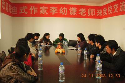 人文与管理系刘华副主任,学生秘书蒋群老师,06、07级心理专业辅导员王远芳老师参加了交流会。首先,刘华副主任向李幼谦老师介绍了我们系爱心助残的基本情况,并对李老师的到来表示欢迎。助残服务队的学生代表向李老师介绍了助残服务队的成立情况和一直以来开展的活动。在同学们的介绍后,李老师深深为爱心志愿者的服务而感动并也对志愿者服务提出了希望与要求,她表示要用自己的文字来表达对这群志愿者的感谢。会议最后,李老师还送给我们志愿者一本她最近新出版的书《独步天下》,并对人文与管理系的爱心助残活动给予了很高的评价。