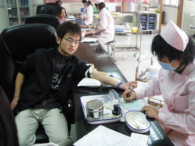 在今年的感恩节来临之际,11月26日上午,怀着感恩社会、报效祖国的心情,药学系07级制药工程四班同学来到芜湖市中心血站,集体参加无偿献血活动,用实际行动践行“医学生誓言”。