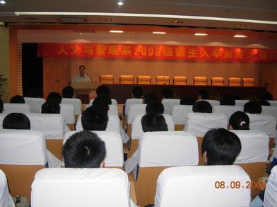 9月8号下午,人文与管理系在三楼学术报告厅召开2008级新生入学教育大会。人文与管理系主任、学生秘书、辅导员和2008级新生参加了会议。会议由人文与管理系副主任刘华主持。会上,教务处教务科长洪亮、人文与管理系党总支书记方继经、校医院副院长储召阳分别从学生的学籍管理、安全教育、健康教育三大方面情况,利用生动的事例,向学生做了详细的讲解,并对学生提出了严格要求,教育全体新生明确自身使命,端正学习态度,珍惜美好时光,抓住机遇,勤奋学习。