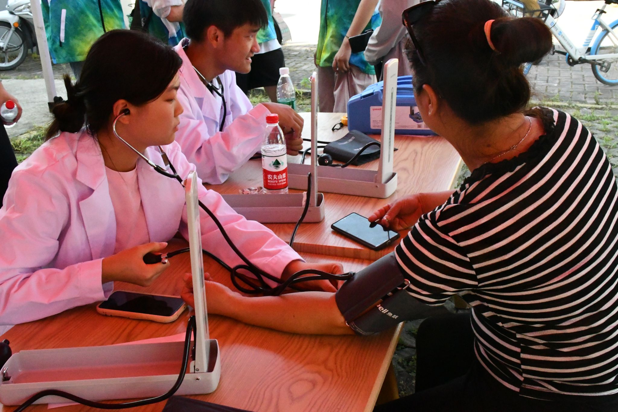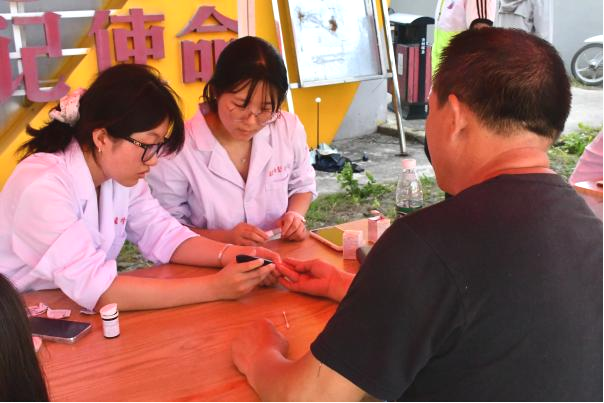 白衣执甲送健康,丹心为民筑长城。为积极响应健康中国战略号召,将医学专业知识转化为惠民实践,提升基层群众健康素养,助力乡村振兴,7月3日,“芦花”志愿服务队前往方村街道开展了义诊活动。本次活动聚焦血压、血糖、体脂检测及儿童视力筛查四大健康服务模块。活动现场,志愿者们分工明确、高效协作,为村民提供全流程健康服务。在基础健康检测区,医护专业学生使用便携式设备为村民测量血压、血糖、体脂。针对暑期儿童近视高发问题,志愿者特别设置视力筛查专区,通过专业仪器检测儿童视力,充分彰显了新时代青年的责任担当与医学人文关怀。