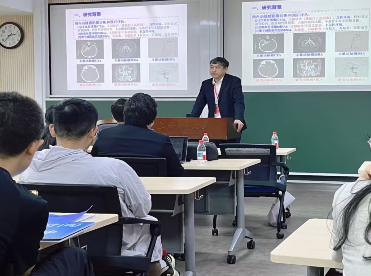 会议邀请国内外7名专家作大会报告,介绍生物医药与人工智能交叉领域最新研究进展,共同探讨前沿动态、科技创新与行业发展。会议同时设立人工智能与药物开发、人工智能与合成生物学、人工智能与计算生物学、人工智能与医学影像、人工智能与医疗仪器等分会场。叶明全教授在“人工智能与医学影像”分会场作题为《人工智能辅助颅内动脉瘤影像诊断与预后评估》的特邀报告,介绍团队在AI+颅内动脉瘤CTA三维图像检测与分割、破裂风险预测及预后评估方面的研究成果。